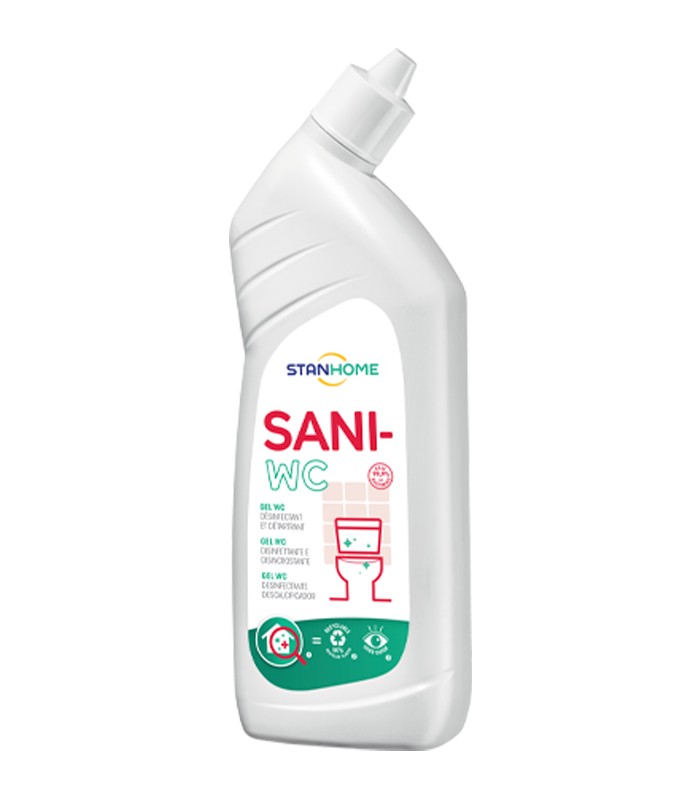 Sani Wc Gel Stanhome, super descaling. Cleans, disinfects by eliminating 99% of bacteria, dissolves limescale in a single gesture. Gel formula that adheres to the walls, disinfects and thoroughly descale your toilet.