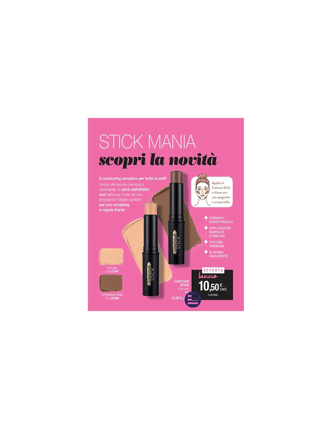 The simple Countouring for all skins! Thanks to the creamy and modular texture, the mat effect stick defines the facial features becoming the perfect ally for a sculpting to perfection.
