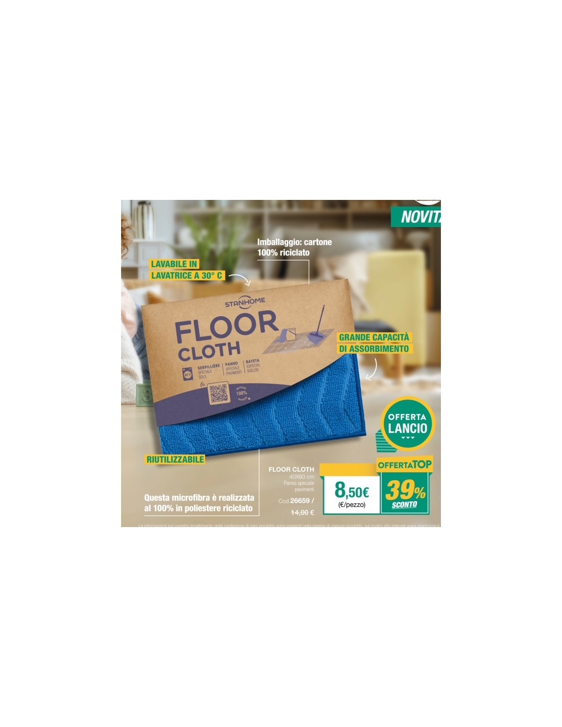 Special floor cloth in MICROFIBER made from 100% recycled polyester, thanks to the double face you can clean all types of floors thanks to the millions of microfibers that increase cleaning efficiency by removing even the most stubborn encrustations, capturing even the most imperceptible dirt and a soft part suitable for drying and polishing the floor