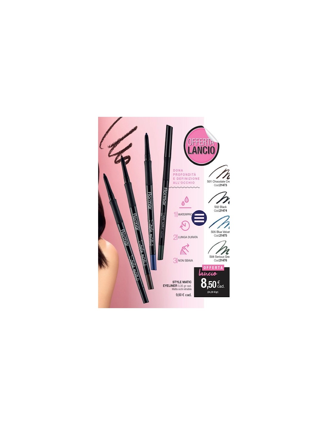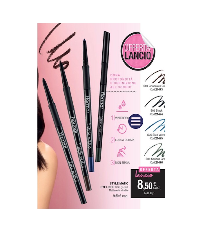 Style Matic Eyeliner is a removable pencil that does not need to be sharpened! Perfect as eyeliner as a pencil for the inner rhyme.   It allows you to easily create fine, precise lines with excellent burr-proof performance.  Long lasting, Waterprof and soft texture.
