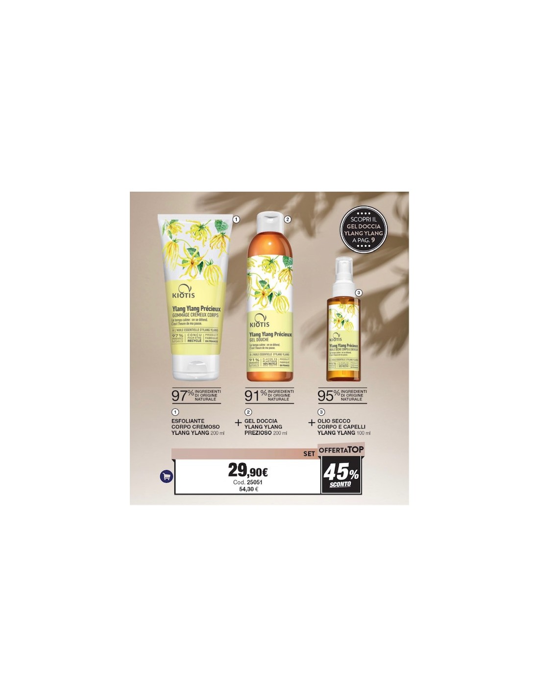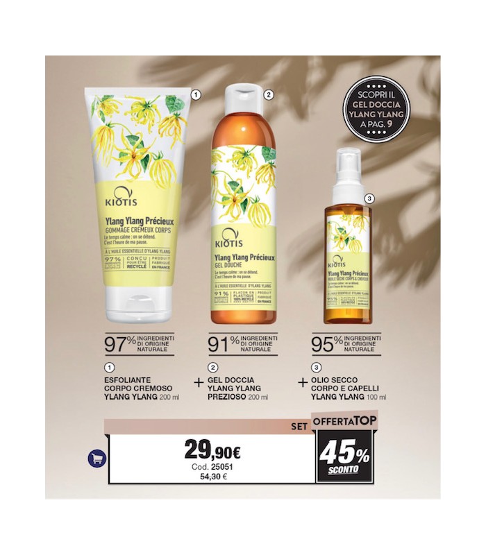 Esfoliante purificante dalla texture avvolgente e cremosa per una esfoliazione efficace che lascia la pelle morbida ed elastica + Bagnoschiuma cremoso con estratti naturali YLANG YLANG rilascia un profumo velluttuoso che vi trasporta in un bagno di fiori di Ylang Ylang + Olio Secco per corpo e capelli per una idratazione della pelle perfetta