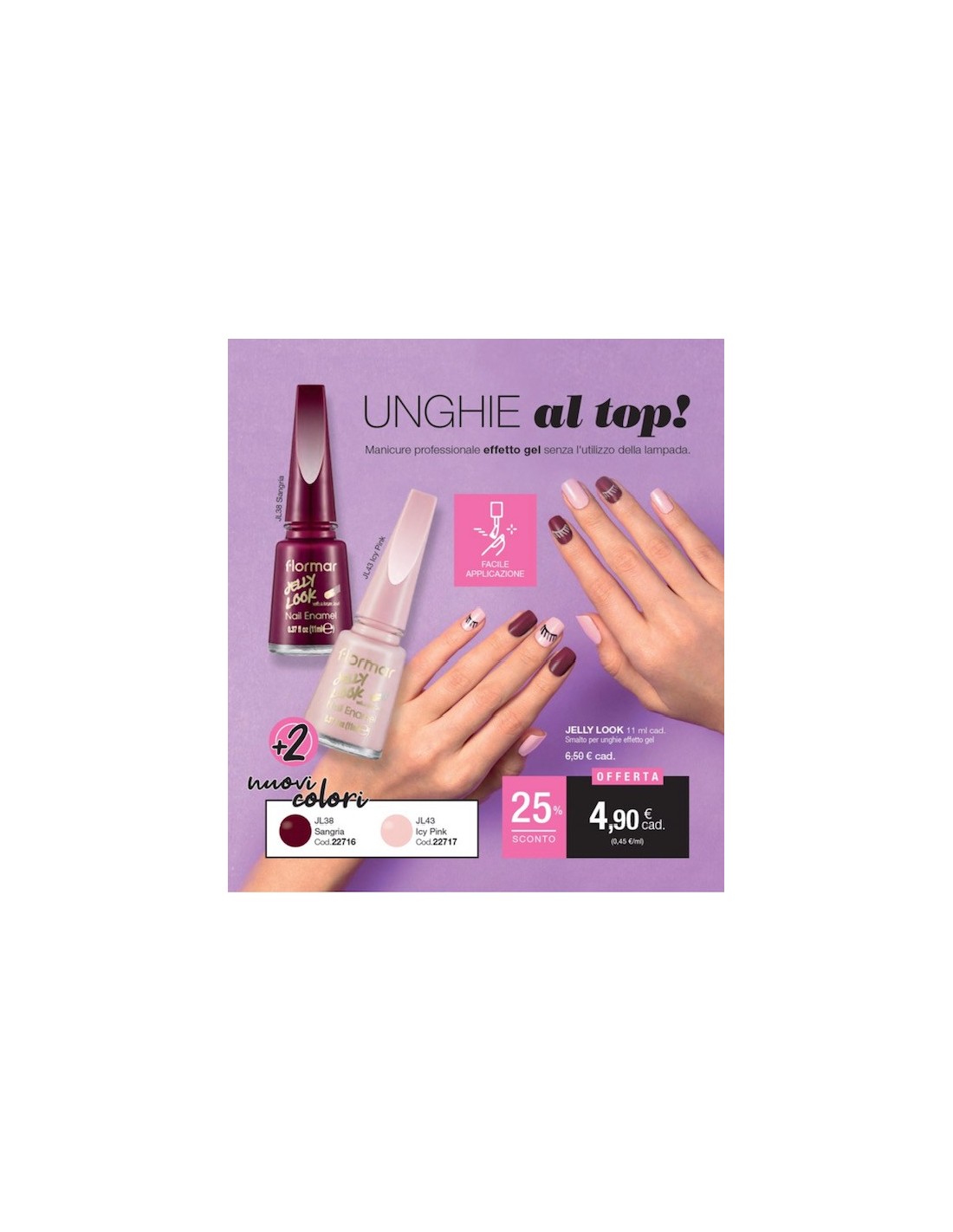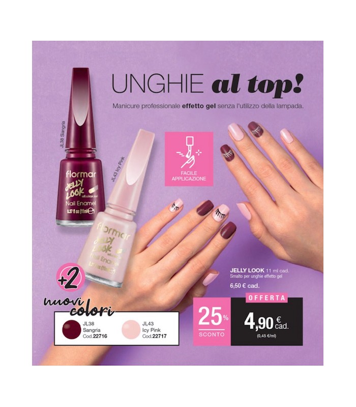 Jelly Look Nail Enamel is a gel effect nail polish that guarantees an ultra bright color. It will be possible to create, thanks to the practical brush, many color variations combining your nails to your pre-finished look, for a nice and always fashionable look, perfect for any occasion. The super gel effect is already evident from the first application we consider, however, two applications.
